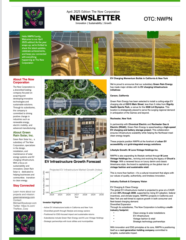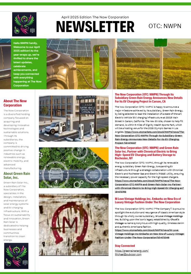 PASADENA, Calif., April 24, 2025 (GLOBE NEWSWIRE) — The Now Corporation (OTC: NWPN), a diversified holding company focused on sustainable innovation, is excited to announce the publication of its April 2025 newsletter. The latest edition highlights major advancements in electric vehicle (EV) infrastructure and the continued evolution of its vintage fashion subsidiary. The Now Corporate […]