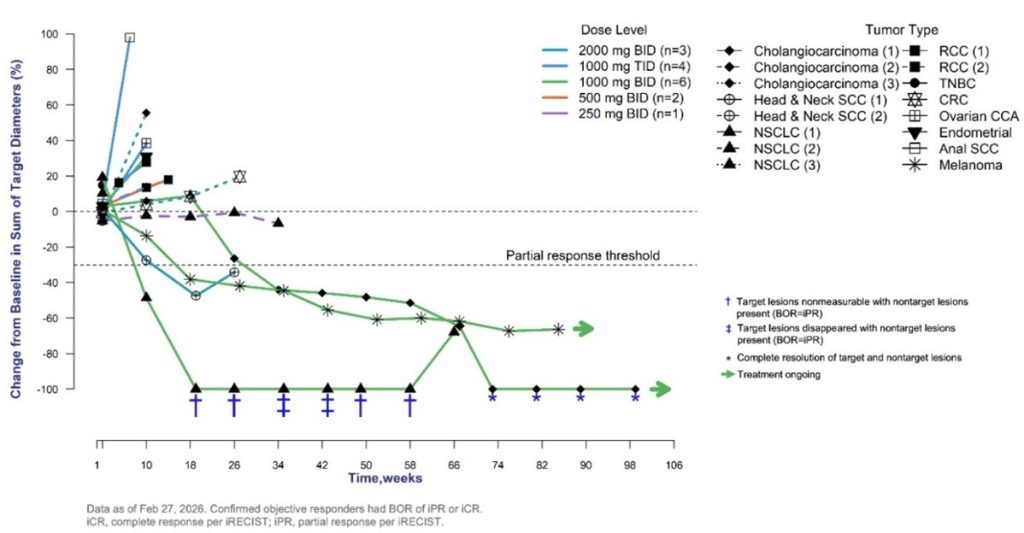 Timothy A. Yap, MBBS, Ph.D., Medical Oncologist and Physician-Scientist at the University of Texas MD Anderson Cancer Center, presented results from the dose escalation portion of the ongoing Phase 1a/1b trial covering data as of February 27, 2026. Results showed that in the heavily pretreated ICI-secondary refractory patient subgroup, twice daily (BID) treatment with PLN-101095 at the highest doses in combination with the ICI pembrolizumab showed antitumor activity. One confirmed overall complete response, two confirmed overall partial responses, including one patient with a complete response of baseline target lesions, and one unconfirmed partial response were reported in patients with cholangiocarcinoma, non-small cell lung cancer (NSCLC), melanoma and head and neck squamous cell carcinoma, respectively. As of the data cutoff date, the median time on treatment for the three confirmed responders was 19 months, who experienced an average baseline target tumor reduction of 89%.